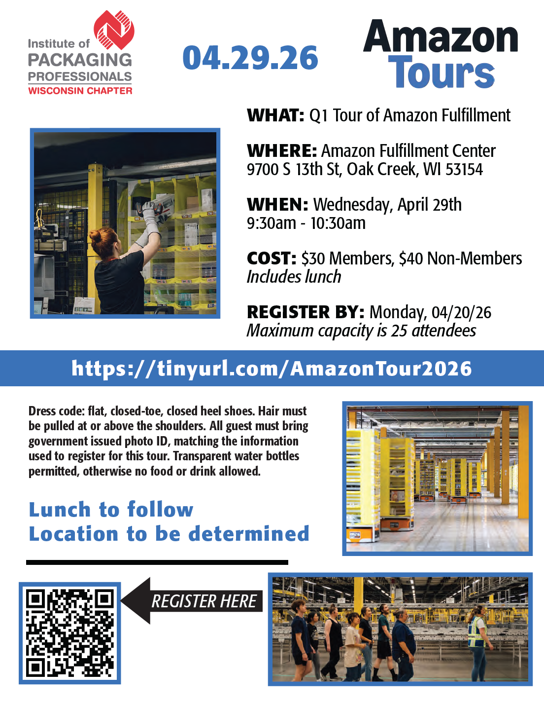 Our Wisconsin Chapter is heading to Amazon’s Oak Creek Fulfillment Center for a close look at how high-volume fulfillment runs at scale. This 2.6 million-square-foot, four-story facility operates around the clock, using advanced robotics to pick, pack, and ship items with speed and precision.